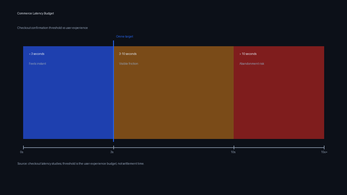 Point-of-sale payments have a hard latency budget. Research from the Baymard Institute and payment processor SLAs converge on the same number: confirmation must arrive in under 3 seconds for a customer-facing payment flow to feel instant. Beyond 3 seconds, abandonment rates climb. Beyond 10 seconds, the experience is broken.